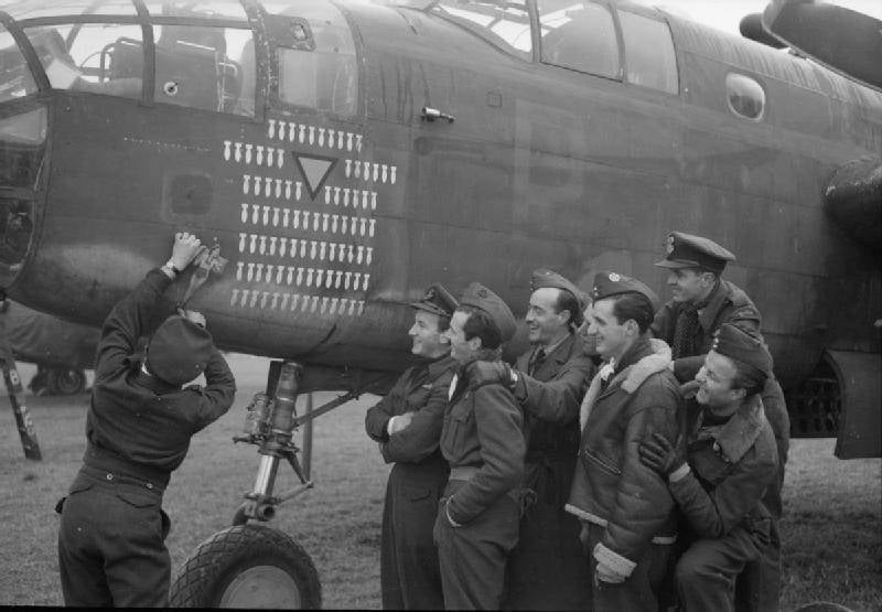 Vliegeniers van het 320 sq bij een Mitchell. Ieder bomteken op het vliegtuig staat voor een uitgevoerde missie.